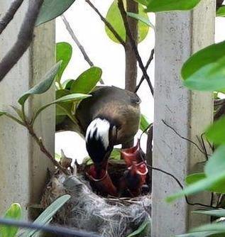 白头鹎喜欢将巢筑在相思树或榕树上,在都市中常见以枯草或芒草穗筑碗形巢于阳台花木、树丛盆栽之中, 每年春天三月到五月是白头翁的繁殖期,这段期间,如果见到一只白头翁单独站在突出的枝头或是树顶上高声鸣叫。