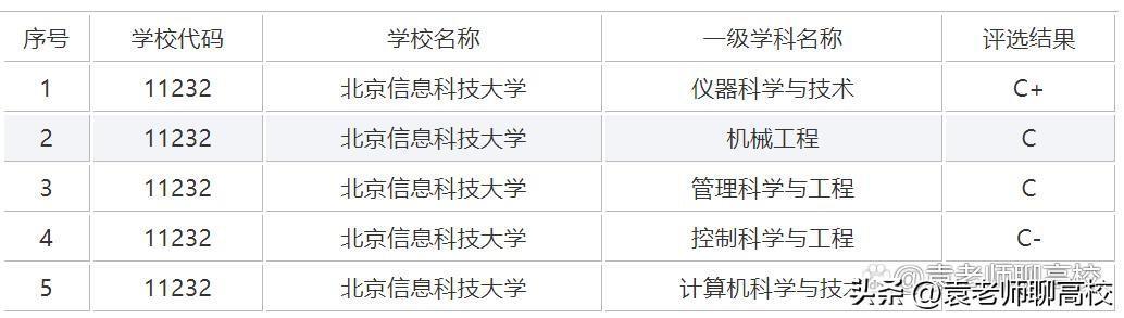 在第四轮学科评估中,北京信息科技大学有5个学科上榜,其中最强的学科是仪器科学与技术,被评为C+,具体可见下图。