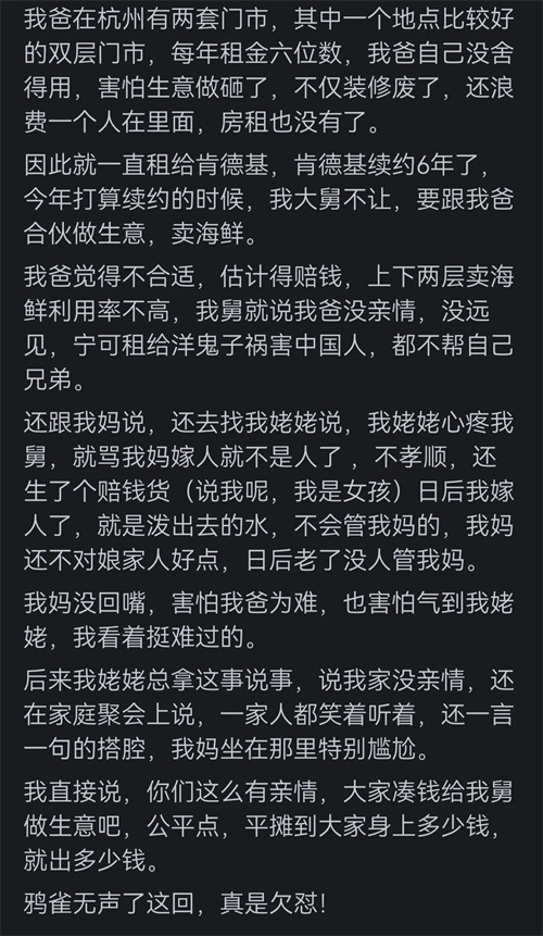没亲情,没远见,宁可租给洋鬼子祸害中国人,都不帮自己兄弟。。。。。。。只要我家有人敢和我说这句话我直接一巴掌就打回去。