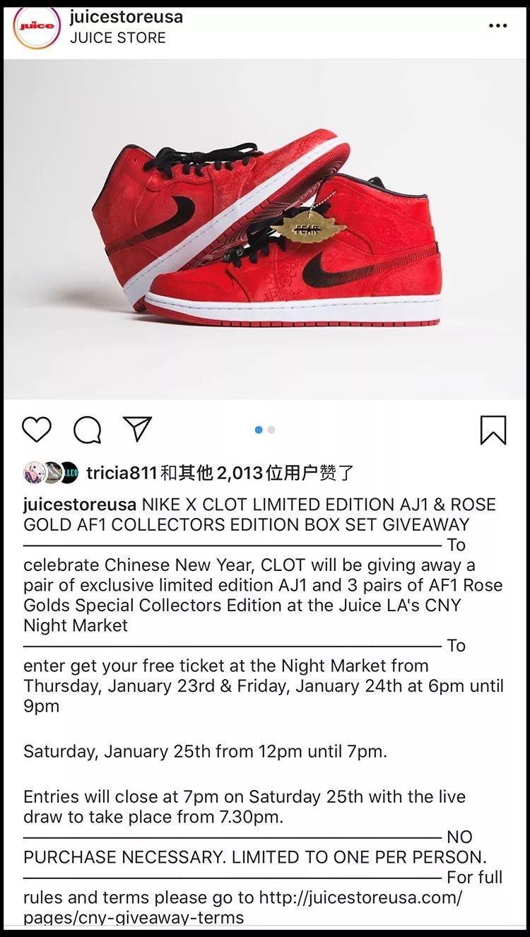 而官方最新消息称,这一双让人眼馋的红丝绸 Air Jordan 1 Mid 与三双礼盒版玫瑰金丝绸 CLOT x Nike Air Force 1,仅作为 juicestoreusa 新春夜市的「抽奖」奖品,并没有进一步市售的消息。