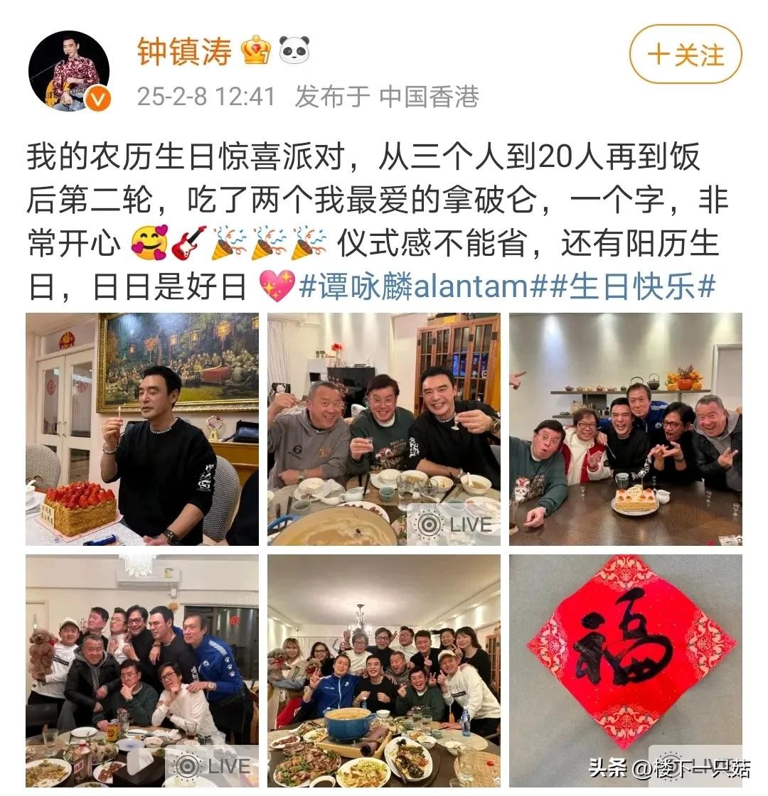 钟镇涛今年一共过了两次生日,上一次2月8日农历生日,曾志伟和温拿五虎齐聚,众人聚在一起品茅台。