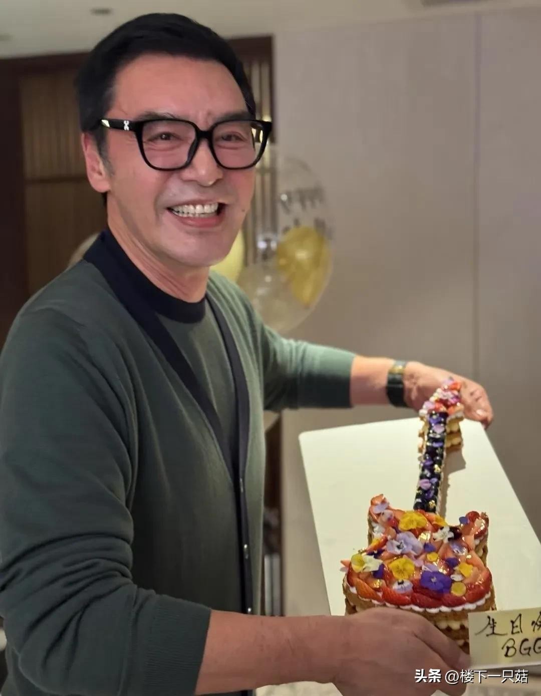 72岁的钟镇涛,穿着灰色针织衫,手捧着吉他造型的蛋糕,脸红红的看起来应该是开心的喝了不少。