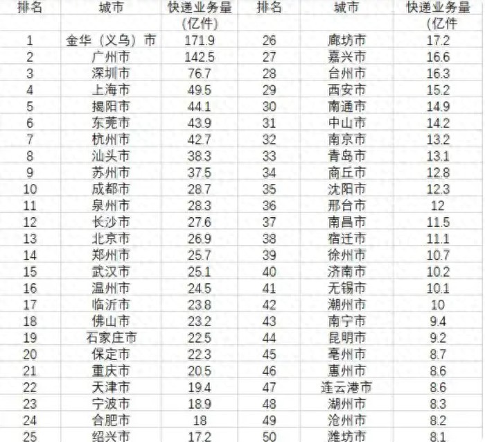 快递业务量排名2-10位的城市分别为广州市、深圳市、上海市、揭阳市、东莞市、杭州市、汕头市、苏州市、成都市。