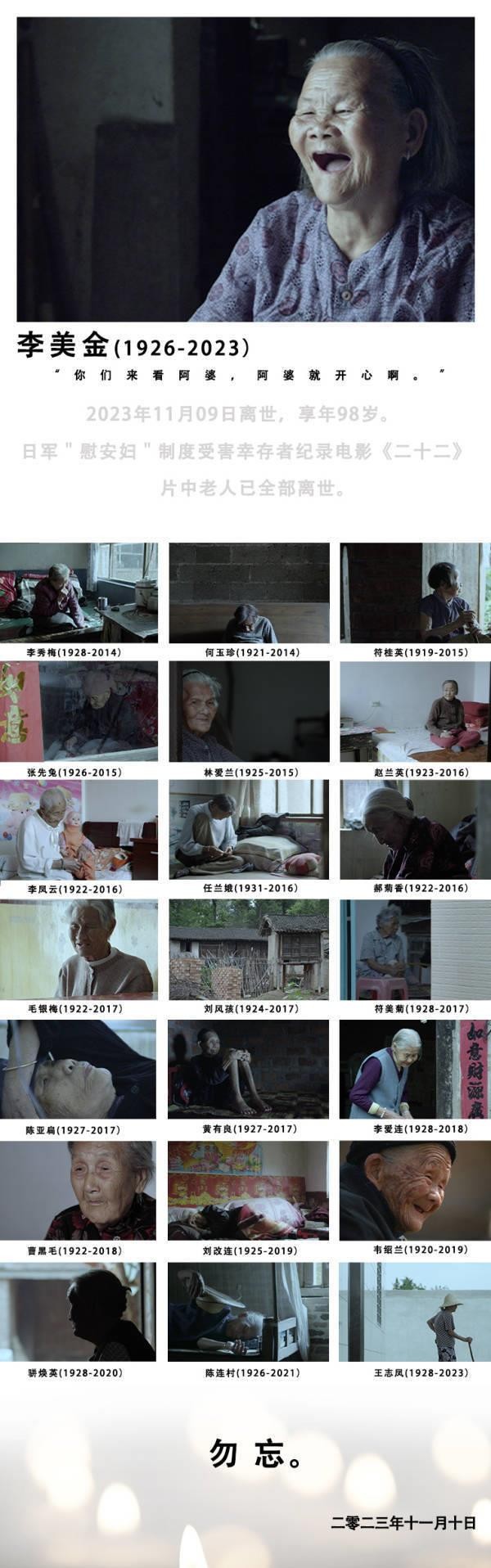22位“慰安妇”中最后一位老人去世,我们不应忘记历史中国曾有20万以上的女性在日军侵华战争期间被迫沦为性奴,这段历史一直为人所唾弃。为了记录这段历史,导演郭柯执导了一部名为《二十二》的长篇纪录片,该片于2017年8月14日在中国内地公映。22位“慰安妇”参与了该片的拍摄,但在影片上映时,仅有8位老人还在世。时至今日,最后一位老人也已离世。22位老人的姓名和照片被发布在影片官方微博上,让我们铭记她们的名字,不要忘记那段历史。影片《二十二》记录了22位老人在日军侵华战争期间被迫成为“慰安妇”的经历。这些老人在片中讲述了她们被强制从家中带走,被送到军营中成为日军的性奴隶的经历。她们的故事让观众们感同身受,也让观众们更加深刻地认识到了这段历史的残酷性。截至2023年9月17日,22位老人中仅剩下一位。