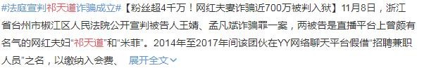 对此,小编特意翻看了一下这方面的信息,他和他的妻子被告上法庭的原因是帮“诈骗团伙”做宣传,从中获利多达30多万元!“不作就不会死”这句话说的是真对!随着案件审理,近日祁天道夫妇“诈骗案”也迎来了最终判决!祁天道妻子王晴因犯诈骗罪被判4年零8个月,祁天道也因诈骗罪被判有期徒刑4年不予缓刑!