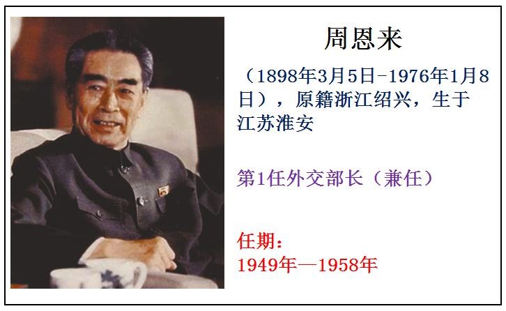 第1任外交部长:周恩来(兼任),任期:1949年—1958年