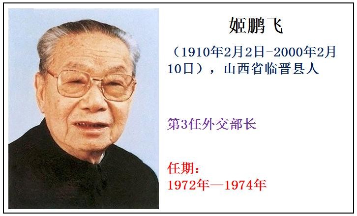 第3任外交部长:姬鹏飞,任期:1972年—1974年