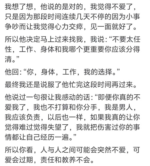 爱是责任,是担当,谁离了谁都过得下去,只是人生一辈子那么长所有的事情都是日复一日年复一年枯燥,有些人一辈子能坚持做自己,不是说什么不爱了就不爱了,爱情不是只有享受,也有共同经历困难,有共同的目标,一个小举动就能让对方心里备受爱护,突然不爱只是你觉得腻了想换下一个而已,一辈子谁能让谁做到天天新鲜感,人就是这样,总有理由借口