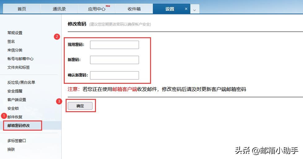 第三步:进入设置页面,左侧菜单栏点击【邮箱密码修改】,依次输入“现用密码”、“新密码”、“确认新密码”,点击【确认】即可(如下图所示);