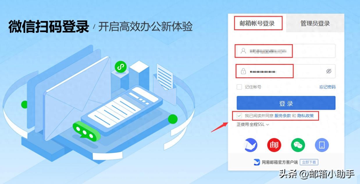 第一步:首先登录网易邮箱网页端,登录地址:https://qy.163.com/login/,点击【邮箱帐号登录】,输入“邮箱地址”、“密码”,“ √ ”我已阅读并同意 服务条款 和 隐私政策,点击【登录】即可(如下图所示);