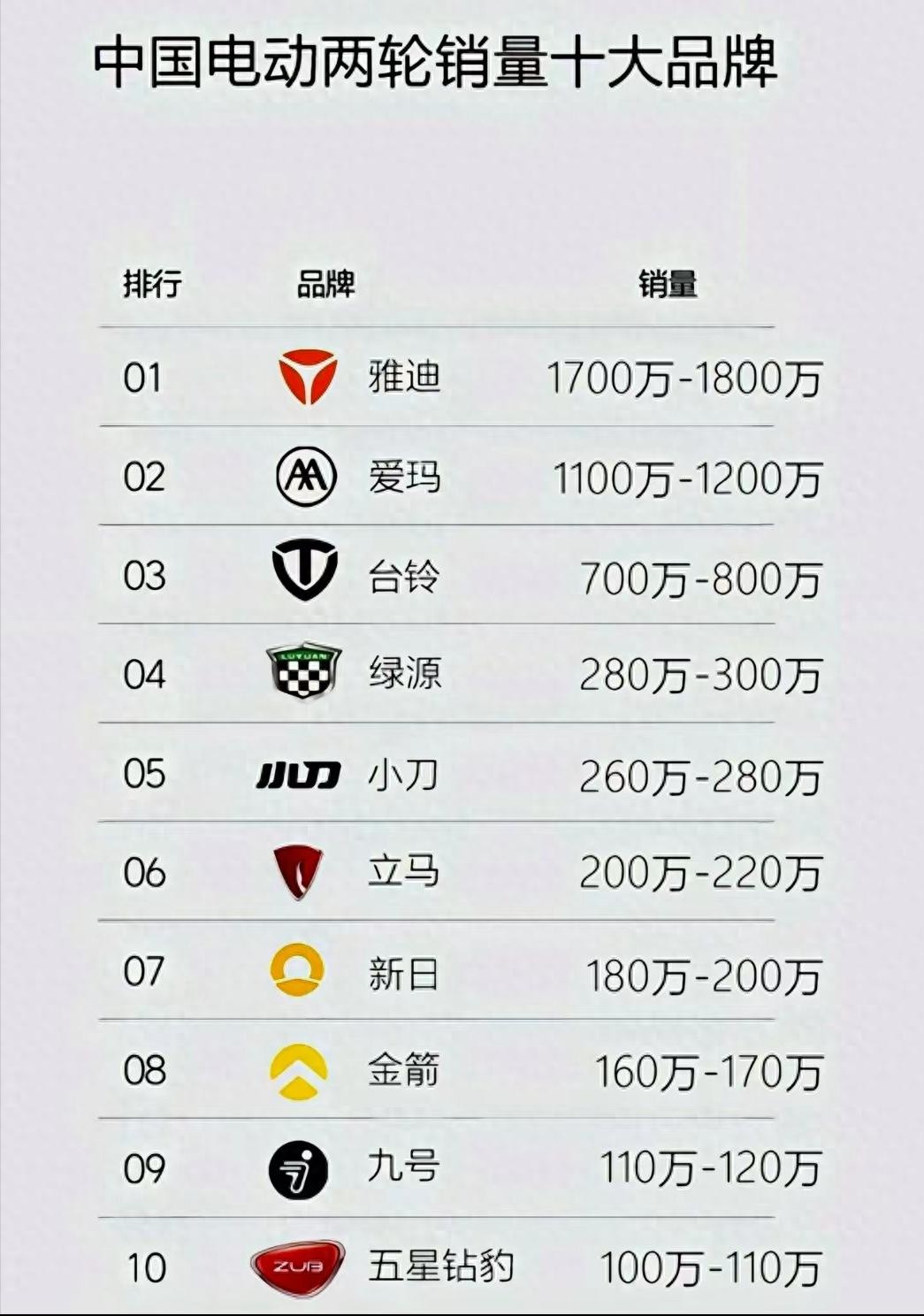 中国电动车排行前10:雅迪第一,爱玛第二,台铃位居第三