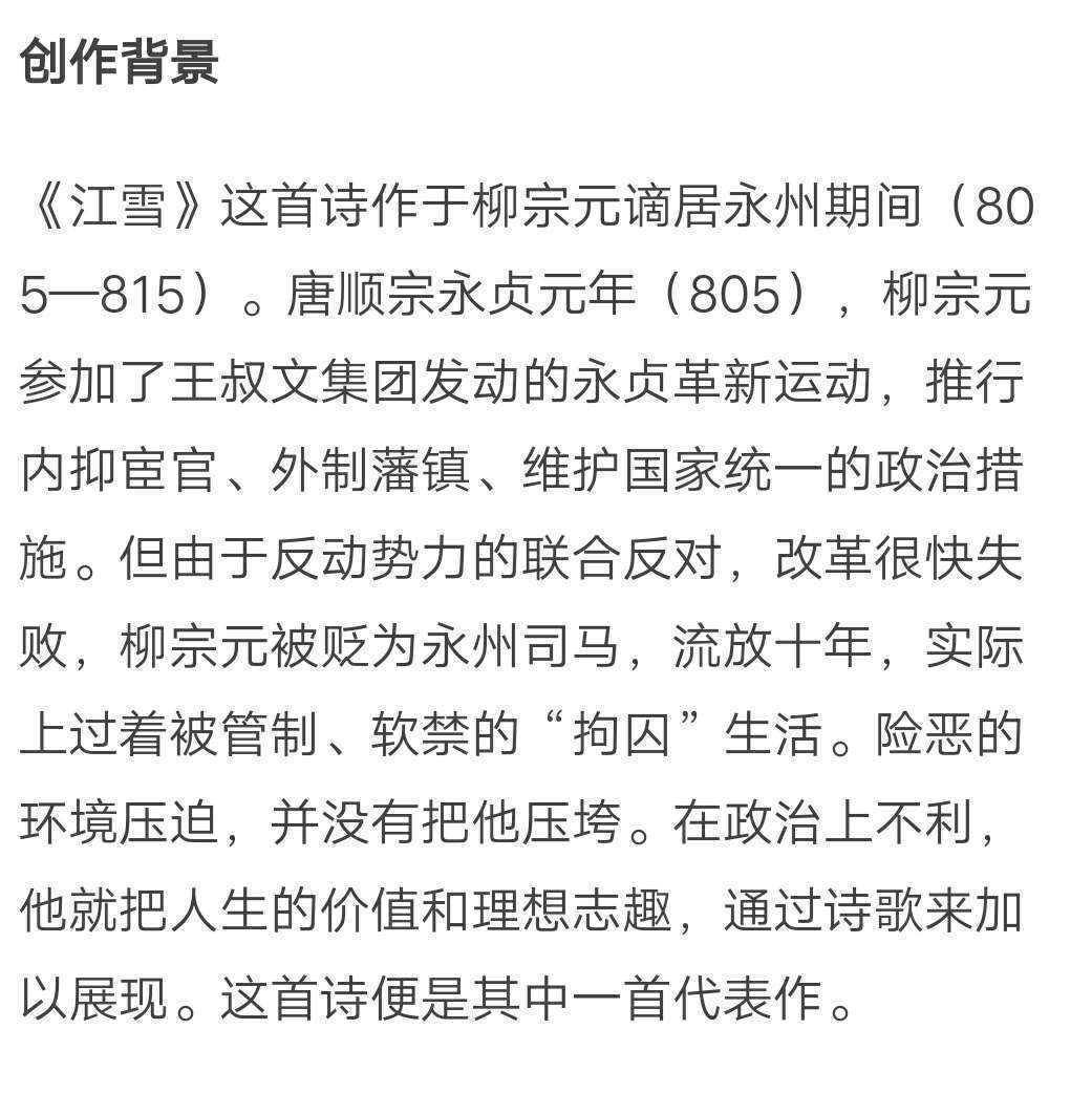 所以说柳宗元通过这首意境深远优美的的冬日垂钓图,其实是在表达寄托着他远大的政治志向和抱负。