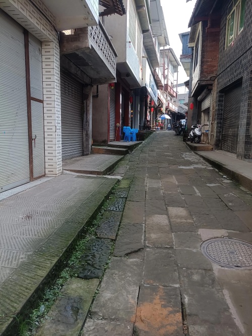 古镇在一个山坳里,有一个长长的下坡,下坡尽头是不大的停车场,过节车也没停满。顺着小路来到古镇上。
