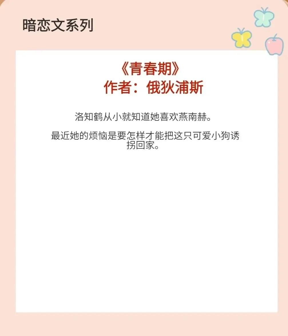 温柔清冷男主vs安静害羞女主,暗恋文,女主和妈妈从小城镇搬到首都,人生地不熟,被阿姨家的熊孩子带出去,却跑了。女主迷路,正惶恐无助之时,男主经过,温柔耐心陪女主回了家。女主对男主很有好感,得知男主住在附近,一直默默关注着他。男主是天之骄子,家境优渥,长得帅,成绩也好。女主不自觉默默关注起男主,从欣赏到心动,不过她知道两人相差悬殊,默默地把这份暗恋藏在心底。并且从男主身上,女主获得了巨大的动力,想让自己变得和他一样优秀。于是拼命努力,考进好大学,进入大公司,成为众人夸赞的优秀女性。后来男主出国,两人再无交集。谁知,女主受朋友所邀去玩剧本杀,居然然意外与男主重逢。由于女主曾了解过男主的喜好,在玩剧本杀过程之中,男主觉得女主的思维方式、爱好与自己十分合拍,后来在几次接触之中,男主更是觉得女主的长相、性格、爱好都与自己完美合拍,就像是灵魂伴侣。于是男主动心了,主动添加女主,慢慢靠近她,主动向女主告白。两人恋爱后,男主逐渐发现,原来女主暗恋多年的人,居然就是自己!对女主满是心疼,也更加宠女主,后期日常甜度爆表!本文最戳我的点是,女主暗恋但不卑微,男主被暗恋但不高冷。他们把彼此放在了同等位置,爱情才看起来格外美好!本文叙事流畅,感情线水到渠成,剧情甜宠励志,让人欲罢不能!二、《青春期》 作者:俄狄浦斯