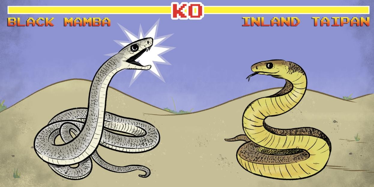 在斗兽场里,黑曼巴尝试首先发动进攻,但它不习惯捕食速度如此之快的对手。另一边,内陆太攀蛇则利用它的敏捷性躲避了黑曼巴的第一次攻击。不过,黑曼巴失去了平衡,准备再次攻击,但内陆太攀蛇更小更瘦,使得黑曼巴的攻击目标变小,概率更低。当黑曼巴再次攻击不中并一个踉跄时,内陆太攀蛇抓准时机,利用它的攻击速度做出致命一击。相比于自己,黑曼巴是一个更大的攻击目标,所以它的尖牙准确无误地插入了黑曼巴的身体。内陆太攀蛇更强的毒液迅速使黑曼巴麻痹,黑曼巴很快就停止了呼吸。
