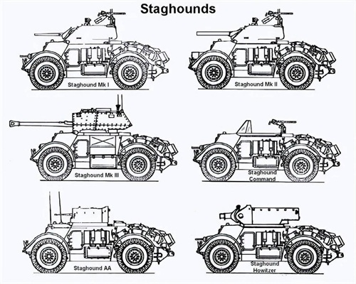 猎鹿犬Mk I是基本型号,基于不同的作战任务,英国人改装出了很多型号。猎鹿犬Mk II型炮塔装有3寸榴弹炮,主要用于对步兵的近距离火力支援,用途有点类似于德国的三突子A型,可以说是英国轮式版本的三突子A型。猎鹿犬Mk III型装有十字军坦克的QF 75毫米炮及移除机枪,用于支援重火力部队,共生产100架,用途就是机动版的支援重炮。猎鹿犬指挥型移除炮塔改为加装无线通讯装置。T17E2猎鹿犬防空型(AA)在T17E1装上弗雷泽-纳什(Frazer-Nash)双联装勃朗宁M2重机枪炮塔,共生产789架,不过战场上的作用有限。T17E3装有75毫米M2/M3榴弹炮。