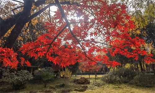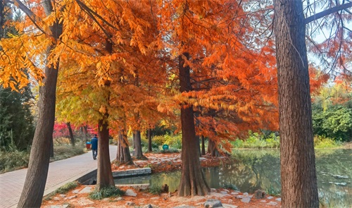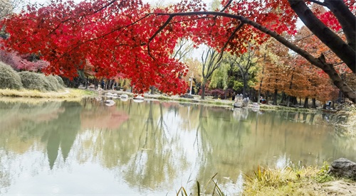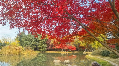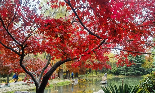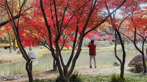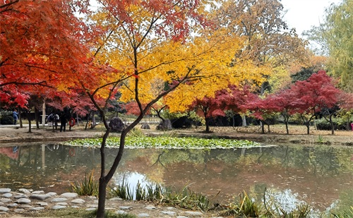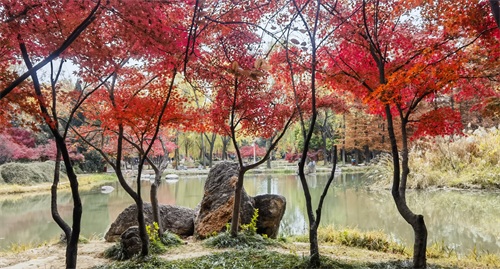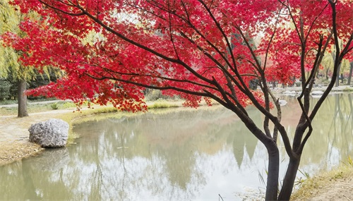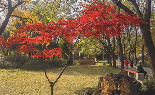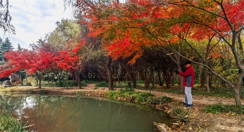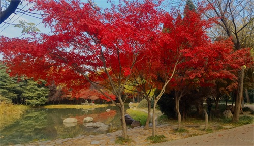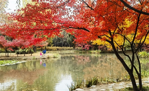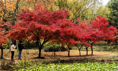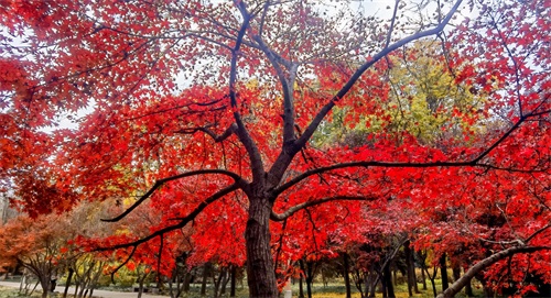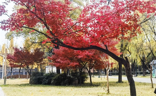 隋唐植物园里,枫树一棵棵,一排排,一片片,鳞次栉比。枫树下,青色的草地,美丽的鲜花。那景致啊,有如油彩画都绘出的色彩,美丽极啦!