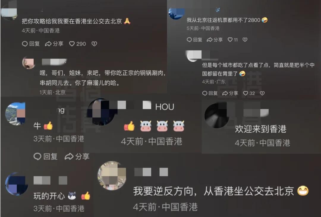 在社交平台上,许多网友从第一天追到了第十三天,每当有网友看到了自己的家乡,就会打出“到我家了”。也许多网友表示很佩服博主,不停地打出赞美之词,连许多香港网友也连称博主很牛。甚至还有香港网友说:把你攻略给我,我要在香港坐公交去北京。