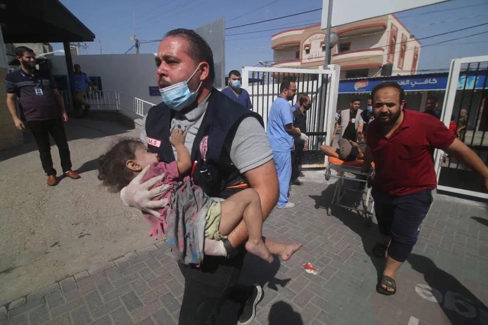 被以色列空袭后,工作人员正在把受伤的儿童送往医院