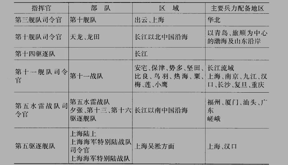 民国16年之后,日军各舰队及其活动区域、兵力配备如下表: