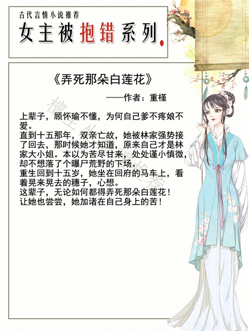 简评:本是王府嫡女的顾怀瑜,一出生便被奶娘调包,假郡主鸠占鹊巢,且害得她受尽凌辱而亡,重新回到十五岁这年,她只想弄死表面娇憨可爱心思却极其恶毒的白莲花,一路打脸,却意外重逢了同样重生的宋时瑾,终获幸福。