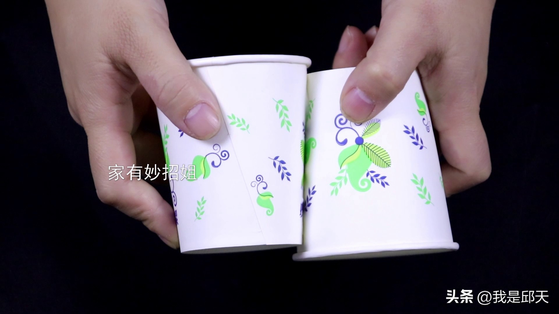 然后拿另个纸杯粘在涂抹胶水的地方,为了粘得更加贴合,两个杯子是反方向粘的。粘好后,我们先不要动它,用手按压上10秒钟左右,使它们固定。之后我们就可以将它放在一边等胶水变干。如果没有时间等的话,也可以用吹风机吹一吹,这样也能加速胶水的变干。
