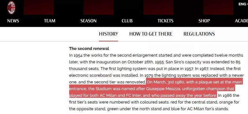 所谓梅阿查是国米专属名称也是无稽之谈,首先梅阿查虽然是国米传奇巨星,但他也效力过AC米兰,而AC米兰在自己官网也可以搜索到将其称之为“梅阿查球场”的文章。同理,国际米兰的官网文章也更多的将其称之为“圣西罗球场”。