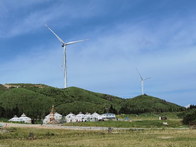 出了滑雪场大厅,迎面看到了高高的七彩滑雪道。远处山坡草地上分布着好些蒙古包,给人有到了内蒙草原之感。
