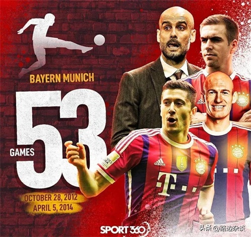 从2012年11月3日客场3:0击败汉堡开始,到2014年4月5日客场被奥格斯堡1:0击败,拜仁慕尼黑在德甲取得了46胜7平的惊人战绩,跨赛季53轮联赛不败,胜率高达86.79%。更是在2013年取得了全年德甲联赛不败的成绩。53轮不败的成绩,位列欧冠五大联赛连续不败记录排行榜第二名。