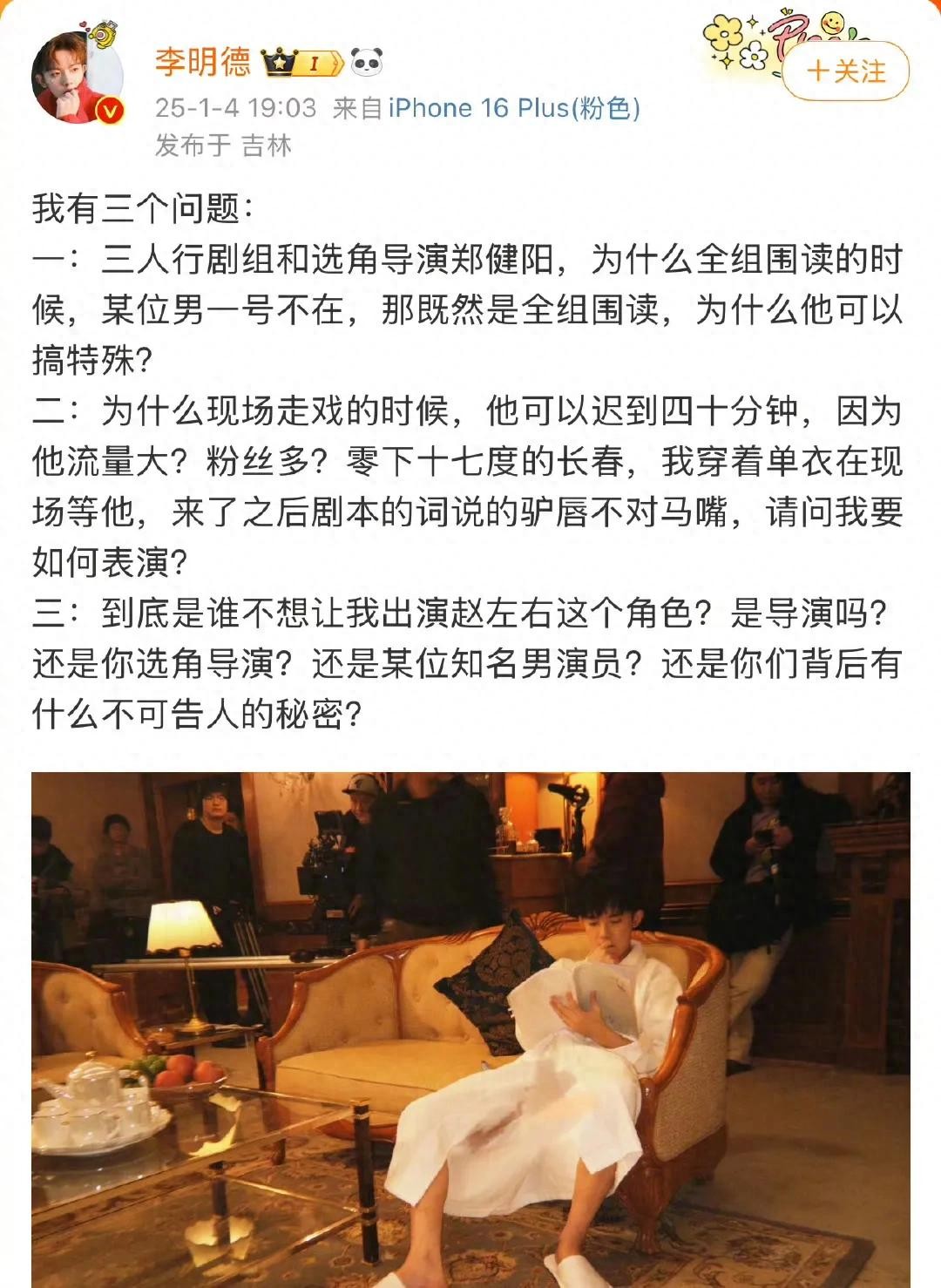不出所料,在李明德控诉后的第一时间,《三人行》剧组很快就发声称,李明德曾暴力损坏酒店财务,无辜缺席围度,所以违约开除。