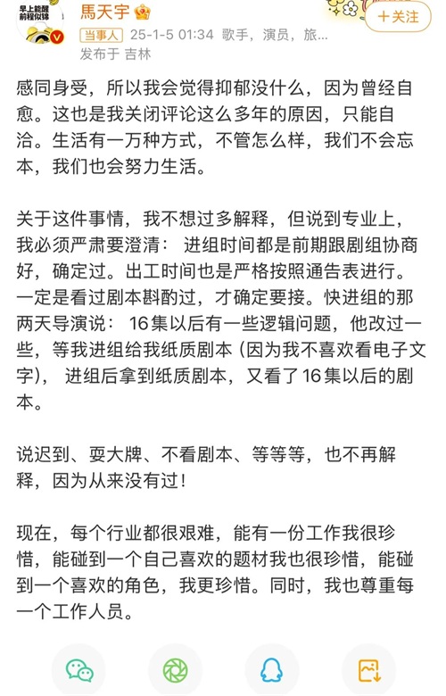 可他没想到,他终究是看浅了娱乐圈的水,就在1月4号,他在网上连发三篇微博,公开控诉马天宇在剧组搞特殊、耍大牌。