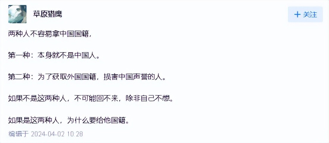 纷纷表示对他行为的不满,还说像他这样为了获取外国国籍,损害中国名誉的人就不应该给他国籍。