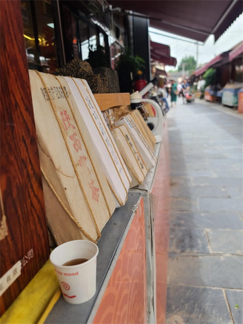 小镇东西走向,有三条主街,最北一条街主要是卖茶喝茶,街面上沿街摆着自家的茯茶,几个煮茶壶煮着几个主要茶品种,来人了,就倒入小小的纸杯里,给客人品尝并做介绍,如果味道喝对了,就引客人到身后的关中庭院里,坐在茶桌上细品。院落里是茶桌茶具遍布,茶叶也是琳琅满目。如果你渴了,走一走这条街,茶水可以免费喝。