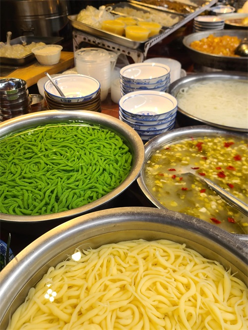 中间一条街比较混杂,即食的小吃颇多,色香味直截了当,非常诱人食欲。我们就在此吃了三色于一碗的浆水鱼鱼,三种味道于一笼的菜卷,还有泾阳当地的让饸。