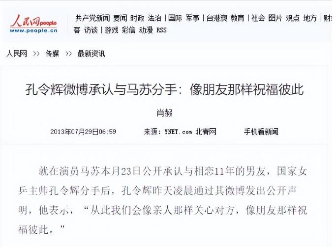 人民网2013年7月29日:孔令辉微博承认与马苏分手:像朋友那样祝福彼此