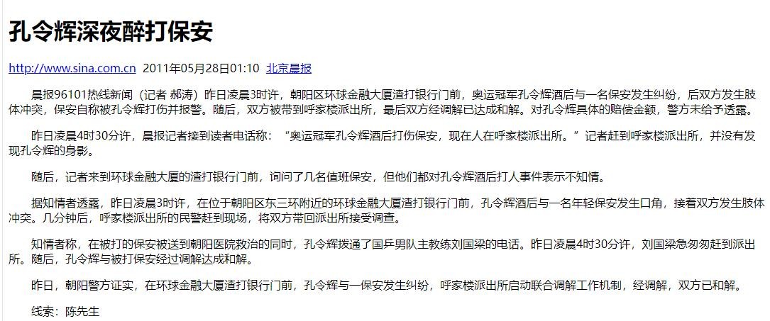 跟这件事情相似的还有,也是在深夜醉酒之后,与一位年轻的保安在朝阳区环球金融大厦渣打银行门前大打出手,最后还闹到了警察局,刘国梁在凌晨四点半去局子里捞人。
