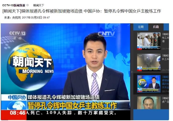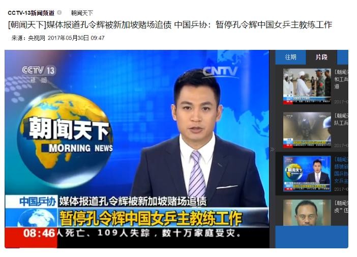 [朝闻天下]媒体报道孔令辉被新加坡赌场追债 中国乒协:暂停孔令辉中国女乒主教练工作