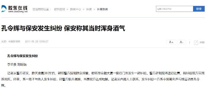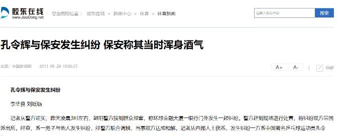 胶东在线2011年5月28日:孔令辉与保安发生纠纷 保安称其当时浑身酒气