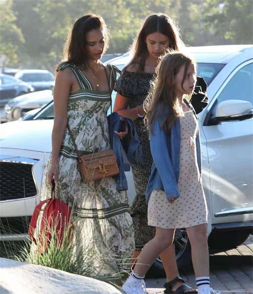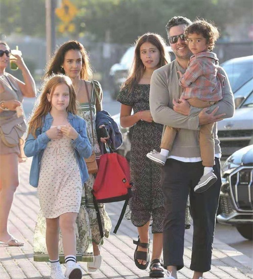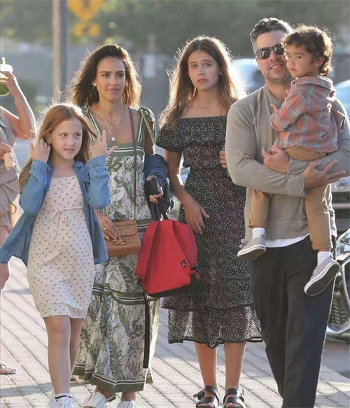 近日,杰西卡一家五口外出,杰西卡身穿长裙彰显女性魅力。