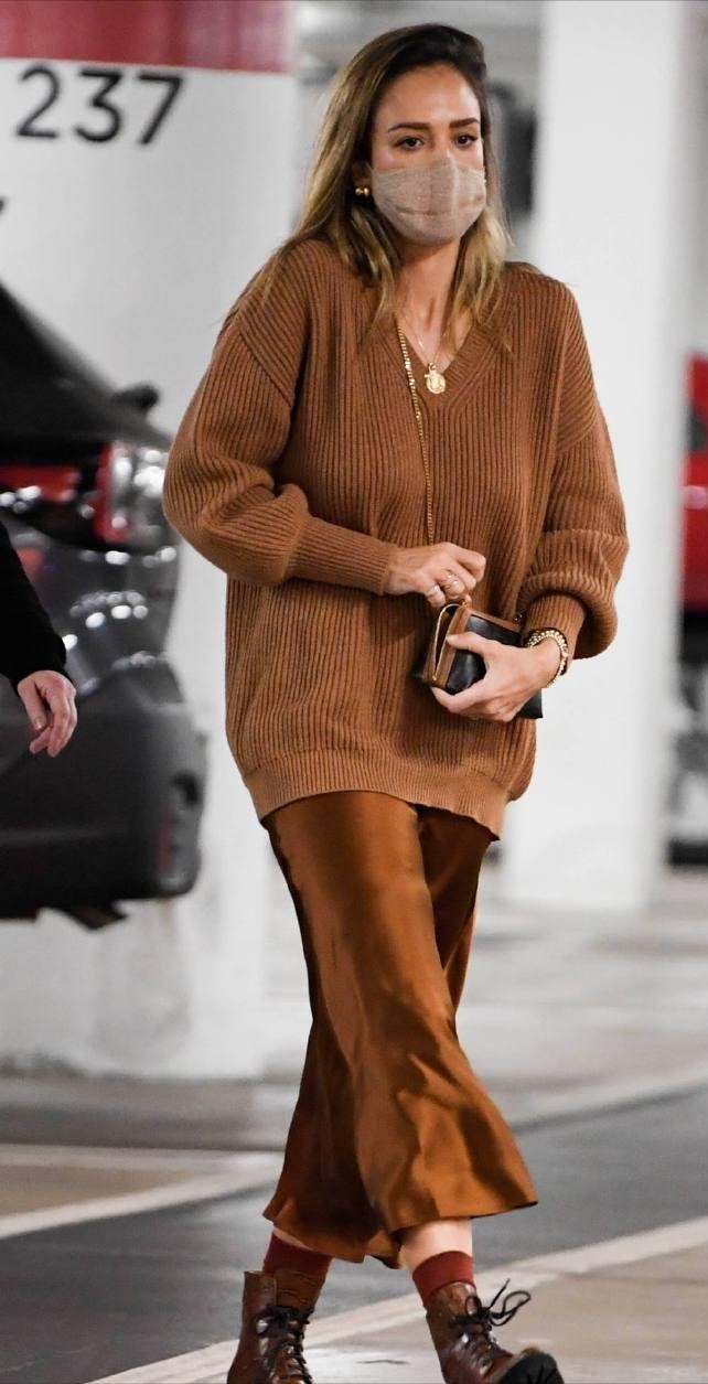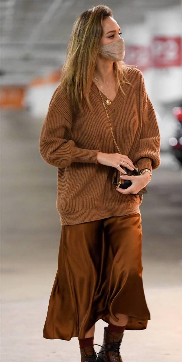 一身焦糖色造型搭配披肩金发,气场又美又飒!