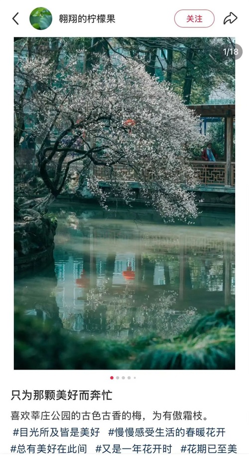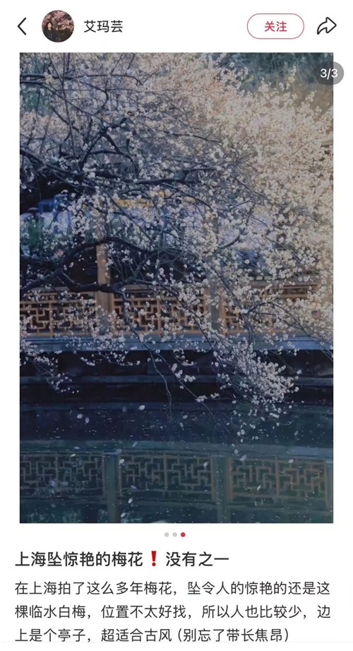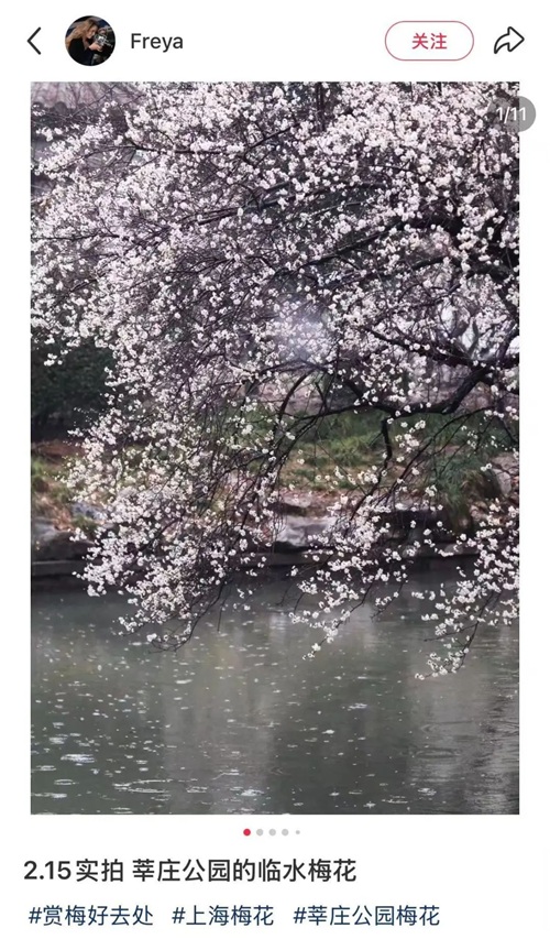 今年,莘庄公园一颗临近河岸的梅树火了