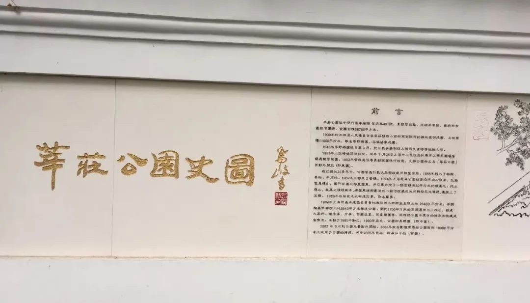 ▷ 1952年初,将果梅园的篱笆门改建成木制大门,在园内铺设草坪,栽植牡丹、紫薇、丹桂、樱花等树木和草花;同年,以莘庄公园为名对外开放。