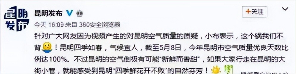 这段话在现场就引起了部分中国留学生的强烈不满。她的家乡昆明可是被称为四季如春的“春城”,怎么可能存在空气差的问题呢?