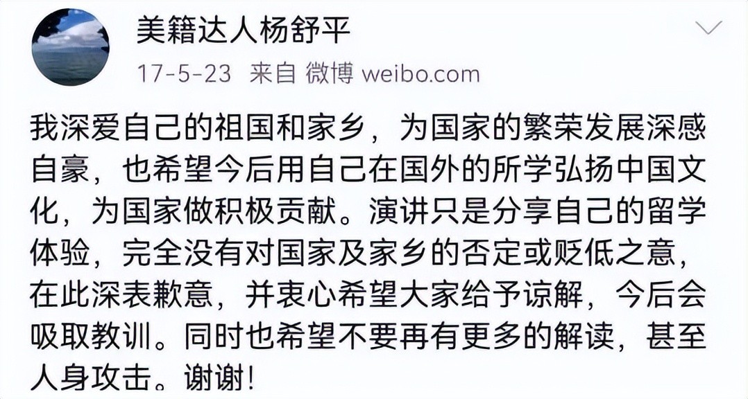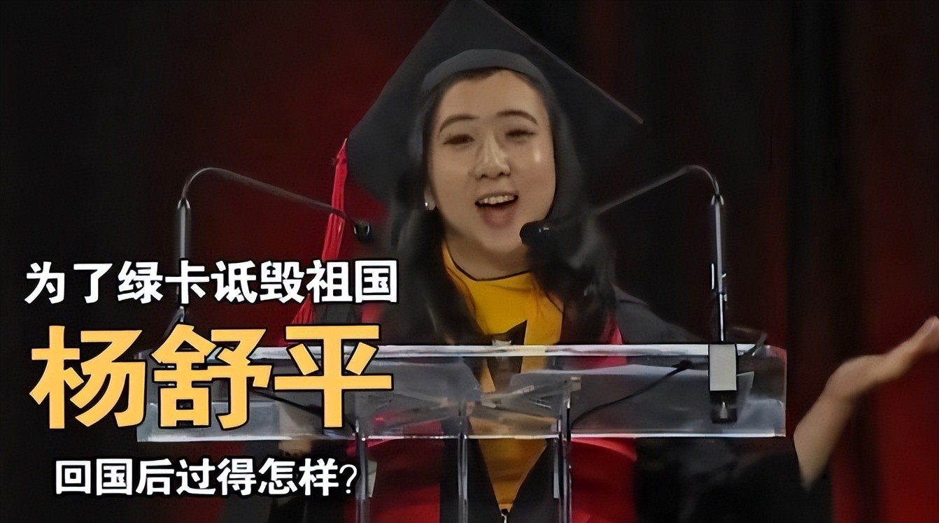 2017年5月21日,杨舒平在毕业典礼上为了讨好美国获得绿卡,无底线的跪舔美国,诋毁中国,声称美国的空气香甜,诋毁中国空气污浊不堪。