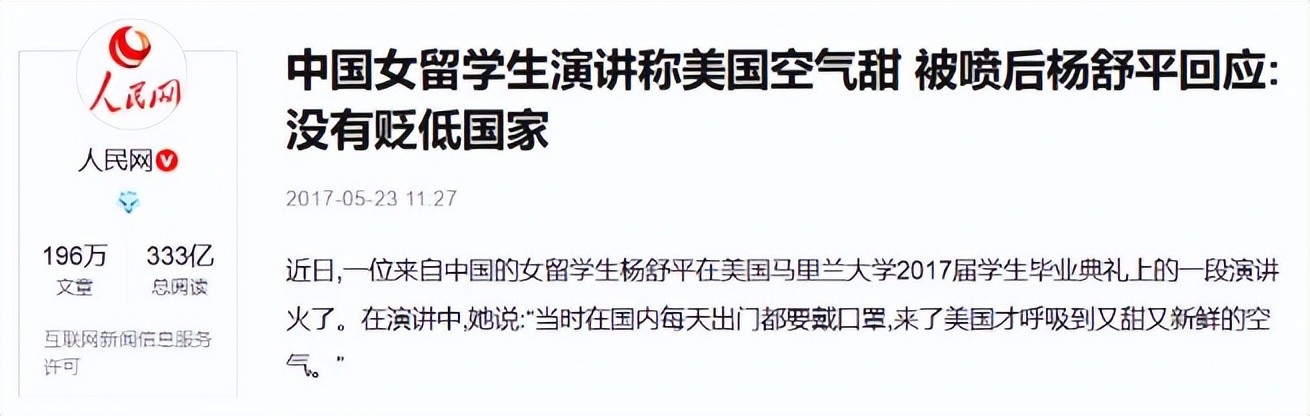 人民网——中国女留学生演讲称美国空气甜 被喷后杨舒平回应:没有贬低国家