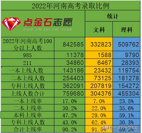 对比高考,2022年河南高考报名人数130万,其中参加高考84万左右(根据一分一段表100分以上的人数为842585人)河南省2022年高考招生计划数633944,录取率为71%。上线率接近90%。对比高考的专科线和中考的建档线也可以发现,高考比中考低近200分。