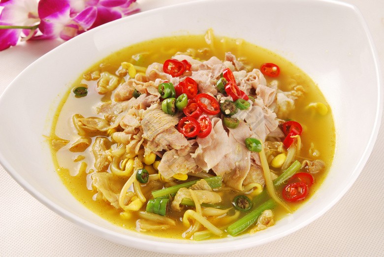 酸汤肥牛是很多川菜馆的常见菜式,是一道又酸又辣的美食。做好酸汤肥牛的关键是汤的调味,要酸辣得恰到好处,当然肥牛的品质也要好。酸汤肥牛以肥牛卷、金针菇等为主料,先将肥牛卷氽至断生捞出,金针菇焯水后沥干,接着将油锅烧热,投入姜蒜米爆香,下和野山椒末稍炒,掺入鲜汤,同时下入香芹段和香菜稍煮,捞出所有料渣不用,调入盐、味精、胡椒粉,倒入氽熟的肥牛卷和金针菇稍煮,最后撒入新鲜的小尖椒圈即成。