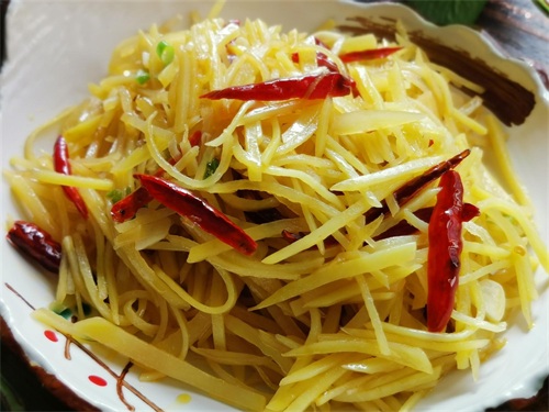 酸辣土豆丝可谓是人见人爱的家常菜,酸酸辣辣的脆爽口感,开胃又下饭。做酸辣土豆丝要先将土豆削皮,切成丝,用凉水冲洗沥干水分,然后将青椒切丝水焯一下,炒锅放油烧热,下入葱花、姜丝爆锅,倒入土豆丝煸炒至发软,加入青椒和调料,稍加翻炒,用水淀粉勾薄芡,淋上熟油,出锅即成。MA igoo网小编提醒,要想酸辣土豆丝好吃,一定要将切好的土豆丝泡在水中洗去淀粉,既能避免其变黑,又能使其在炒烧时保持白嫩、爽脆。