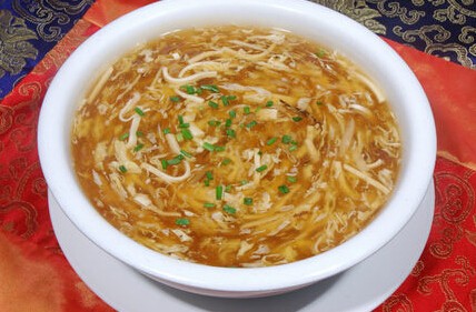 酸辣汤的特点是酸、辣、咸、鲜、香,是一道非常美味的酸辣味家常菜。酸辣汤食材丰富,将豆腐、冬菇、海参、鱿鱼分别切成细丝,同熟肉丝、熟鸡丝放入锅内,加鸡汤、精盐、味精、酱油,用旺火烧至沸滚,再放湿淀粉勾芡后,改小火加打散的鸡蛋,将胡椒粉、醋、葱花及少许猪油放入汤碗内,在锅内蛋花浮起时即改旺火,至肉丝滚起,冲入汤碗内即可。这道汤一般饭后饮用,有醒酒去腻、帮助消化的作用。