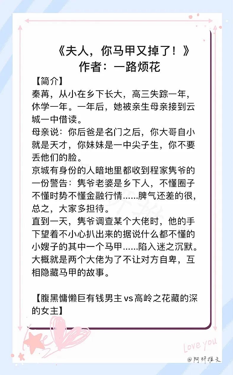 今天推荐的女主又A又飒的苏爽文,一边是女主不停的捂着自己的小马甲,一边是别人一层一层的扒着,这中间过程看起来特别带感特别刺激。记忆特别深刻的就是《夫人,你的马甲又掉了!》被我苒姐那些普通朋友支配的恐惧。因为一个个都是大佬级别的。社会我苒姐,人美路子野。哈哈哈!!喜欢这类女主,你强我更强的那种!#小说#